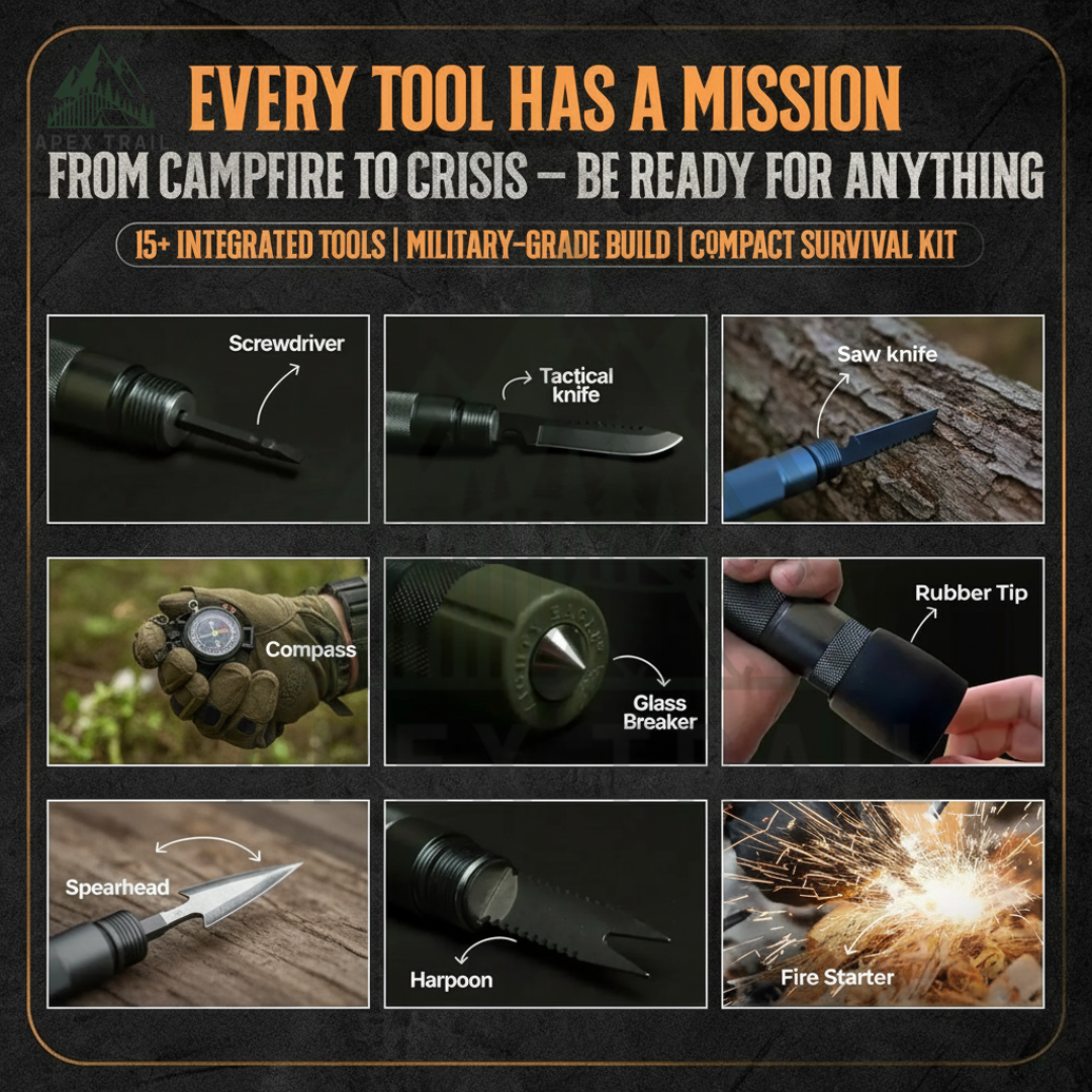 - Multi-tool system: spearhead, harpoon, knife, fire starter, screwdriver, compass, emergency whistle, fork, bottle opener, ice breaker, and more